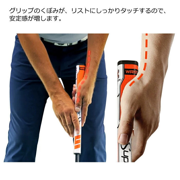 • ノンテーパー型手元から先端まで太さが変わらない(寸胴な)形状です。スーパーストロークが広めたこの形は、下にくる右手が必要以上に強く握り込んでしまうのを防ぐ効果があります。左右の手の握る強さを同じにできる(プレッシャーの均等化)ため、右手の悪さで球が左右に散る人に劇的な効果を発揮します。