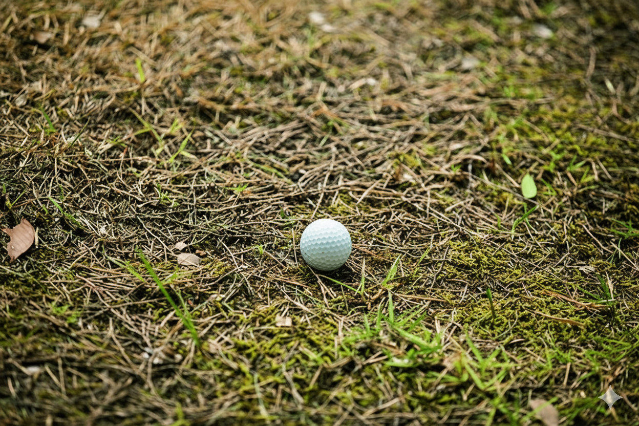ボールが芝の中に沈み込んで見えにくくなっている状態です。芝の抵抗が非常に強く、インパクトの瞬間にヘッドスピードが極端に落ち、ヘッドが抜けにくい(芝に食われてしまう)状態になります。