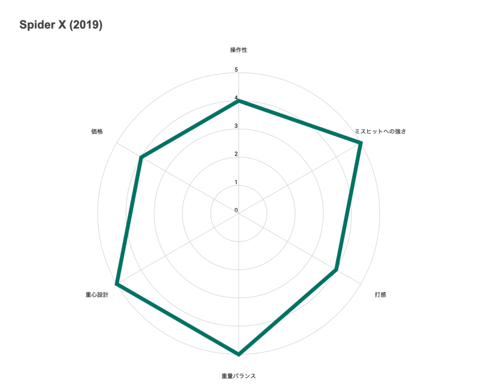 それでは次に、このパターの各性能項目についてもう少し詳しく見ていきましょう。5段階評価でのチャートとともに、Spider Xの特徴を解説します。