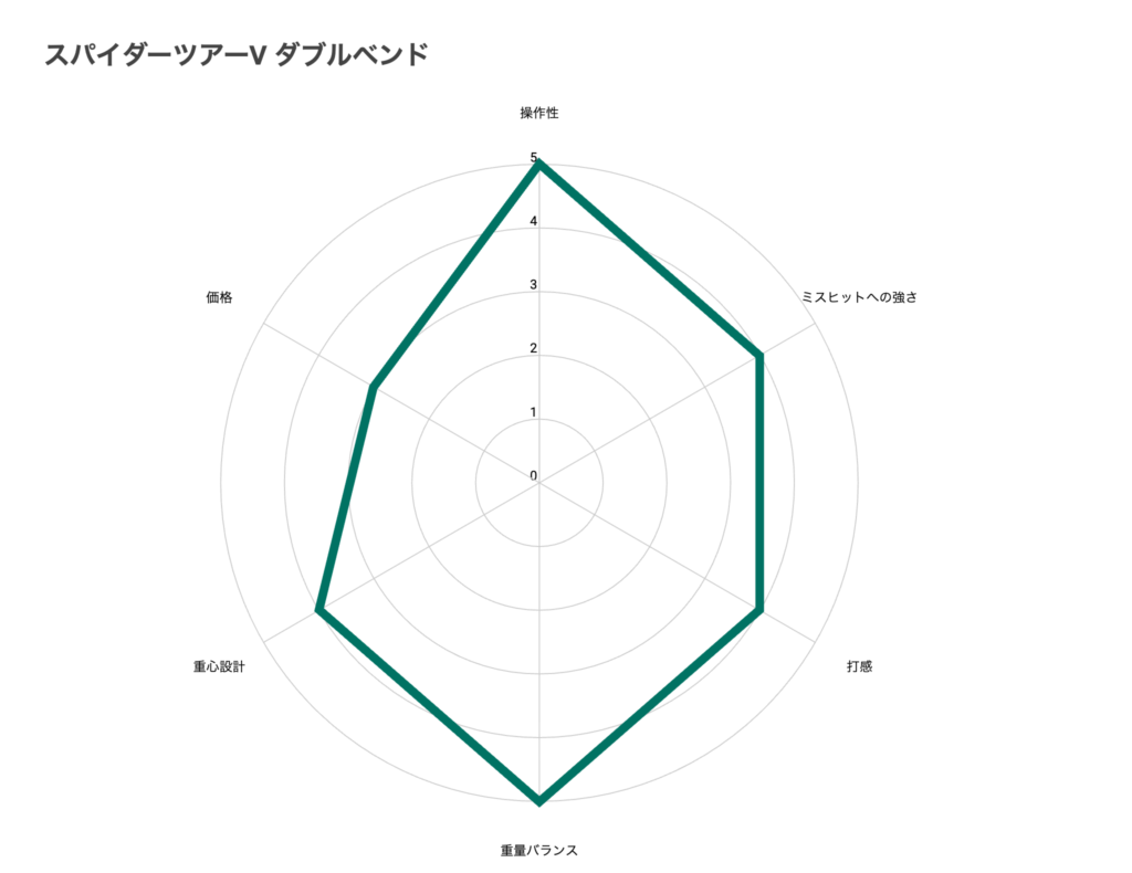 Spider Tour V ダブルベンドの性能を、主要な評価軸ごとに5段階(レーダーチャート想定)で評価してみます。以下の6項目について、筆者の評価とその理由を解説します。