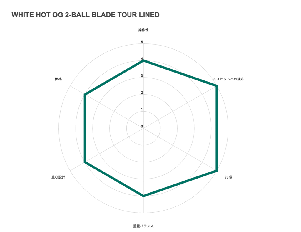 WHITE HOT OG 2-BALL BLADE TOUR LINEDの性能を客観的に評価し、その特徴を可視化するため、主要な性能指標を5段階評価のレーダーチャートにまとめました。